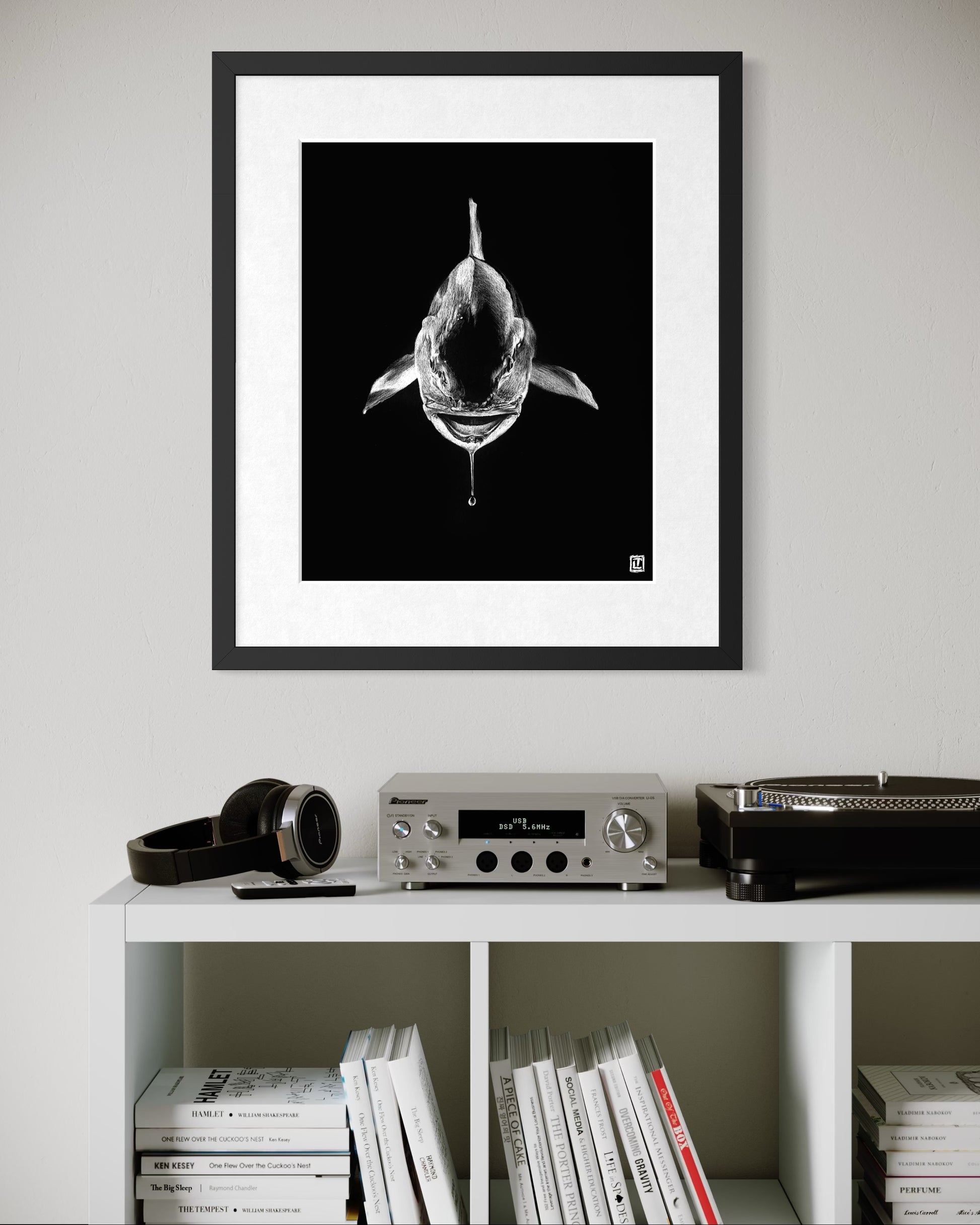 The second piece in Visual-ly’s Redfish Drool series — a haunting, head-on view of the redfish, suspended mid-drip. The stark black background amplifies the glint of scales and the single droplet poised beneath its jaw, evoking both tension and quiet reverence. Each giclée print is produced on archival fine art paper, preserving the tonal range and intricate line work of the original.