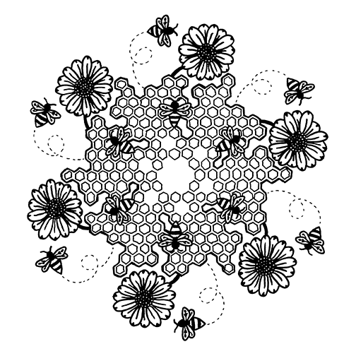 For the word “Sting”, Amanda constructs a radiant mandala of bees, flowers, and honeycomb. The hexagonal lattice at its center anchors a delicate balance between geometry and life, as buzzing paths spiral outward around blooming daisies. The composition hums with movement — a celebration of labor, sweetness, and the sting that protects it.