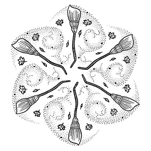 For the word “Sweep”, Amanda creates a swirling composition of brooms and autumn leaves, arranged in a rhythmic dance across the page. Motion spirals outward from the center, guided by dotted trails that suggest wind and movement. The design captures both the physical act of sweeping and the graceful gesture of clearing space — a meditation on change, rhythm, and release.